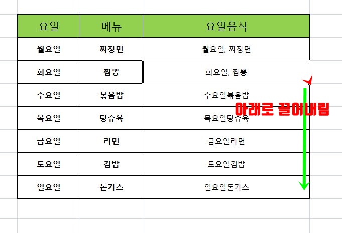 그렇기 때문에 월요일짜장면이 출력된 셀의 빨간 점 부분을 누른 후 아래로 끌어내리면 자동 서식이 적용이 된다.
