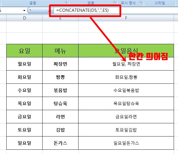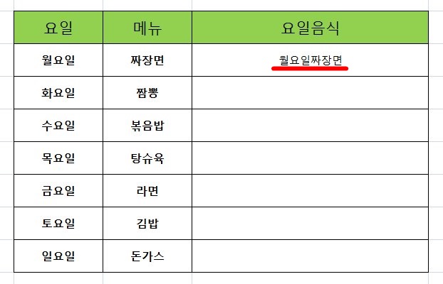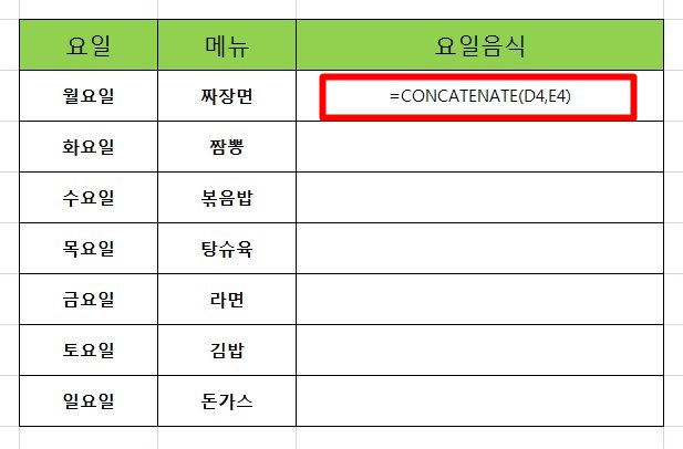 방법은 다음과 같다. 요일음식 행에 =CONCATENATE(월요 일행 선택, 짜장면 행선택)을 선택한 후 엔터키를 누르면 된다.