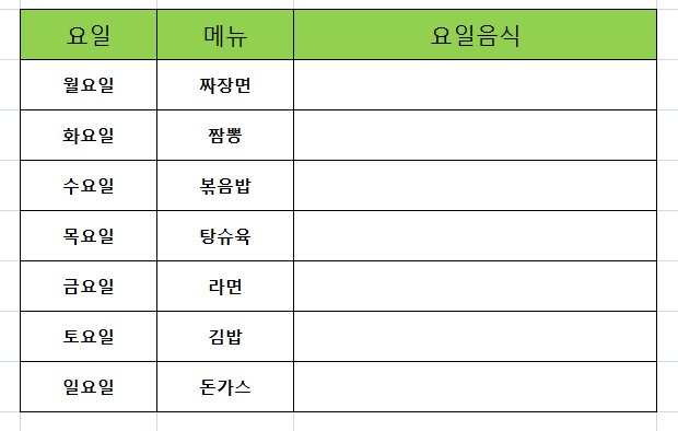 그럼 월요일 짜장면과 같이 각행의 텍스트가 더해져서 요일 음식에 나타나게 된다.