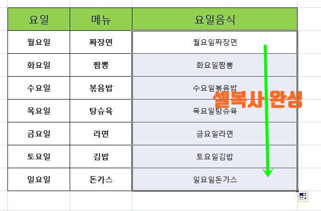 그렇기 때문에 월요일짜장면이 출력된 셀의 빨간 점 부분을 누른 후 아래로 끌어내리면 자동 서식이 적용이 된다.