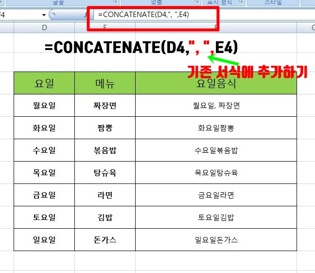방법은 다음과 같다. 요일음식 행에 =CONCATENATE(월요 일행 선택, 짜장면 행선택)을 선택한 후 엔터키를 누르면 된다.