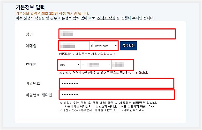 온라인으로 신청을 해봤습니다. 제일 먼저 기본정보를 입력하는 항목이 나오고 있습니다.