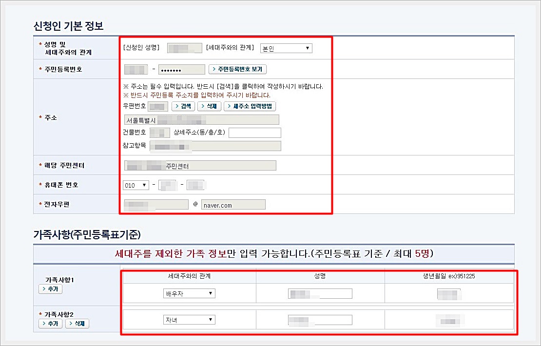 자신의 거주지 주소와 가족들의 주민번호만 입력하면 되는데 그렇게 어렵지는 않습니다.