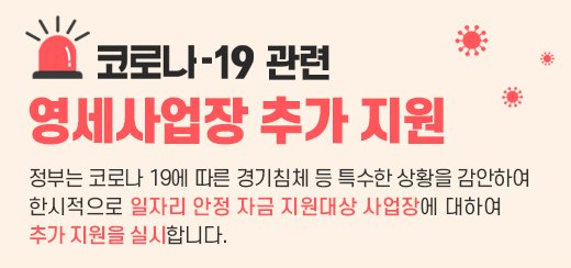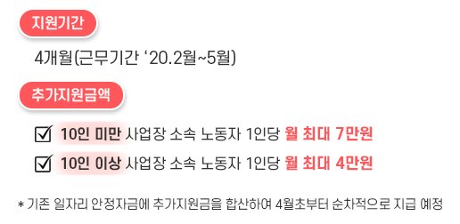 최근 코로나 사태로 인하여 기존에 정부에서 지원되던 부분에 추가 지원을 실시했다고 합니다. 지원기간은 4개월이며 추가 지원 금액은 10인 미만 사업장의 경우 노동자 1인당 월 최대 7만원, 10인 미만의 경우 월 최대 4만 원을 추가 지급한다고 하니 참고하시가 바랍니다.