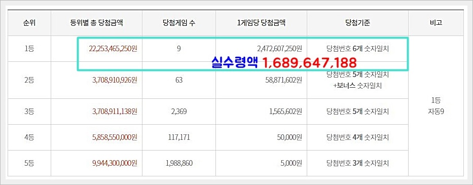 9명이 수령하게 될 로또 1등 당첨금액은 1인당 16억 8900만 원 정도 된다고 합니다. 3억 원 이상 초과 시 공제하게 되는 로또 세금 33%를 공제한 실수령액이라고 합니다. 세금으로만 무려 8억 원 정도가 공제되는군요.