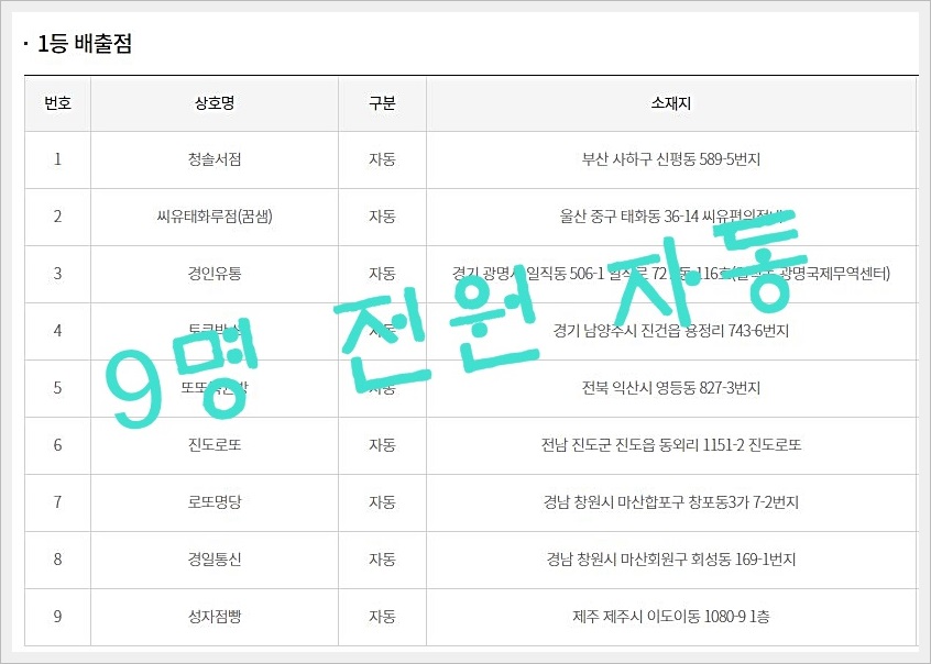 전국적으로 1등에 당첨된 사람은 9명으로 전원 자동 당첨자였다고 합니다. 수동으로 열심히 분석하셨던 분들이 얼마나 한탄했을까 하는 생각이 드는 것 같습니다. 이러한 결과를 받을 때면 분석을 하지 말고 자동구매를 해야 하는 하는 생각이 드는 것 같습니다.