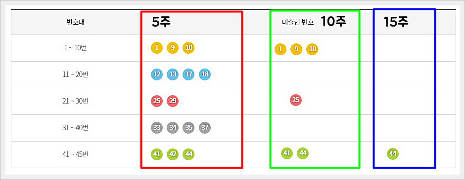 이제부터 다가올 907회 로또 당첨번호가 어떻게 될지 분석을 해볼까 합니다. 최근 5주~15주간의 미출현 번호를 살펴봤습니다. 동행 복권 홈페이지에 있는 자료를 참고했는데요. 10번 구간, 30번 구간이 최근 5주간 가장 적게 출현한 것을 확인할 수 있습니다.