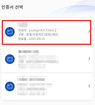자 그럼 어떤 인증서를 보낼 것인지 현재 자신의 휴대폰에 설치되어 있는 공인인증서 목록이 보일 것이다. 단순 은행거래용이라면 평소 사용하던 인증서를 선택하고, 다른 업무 때문이라면 해당 용도에 맡는 인증서를 선택하면 된다.