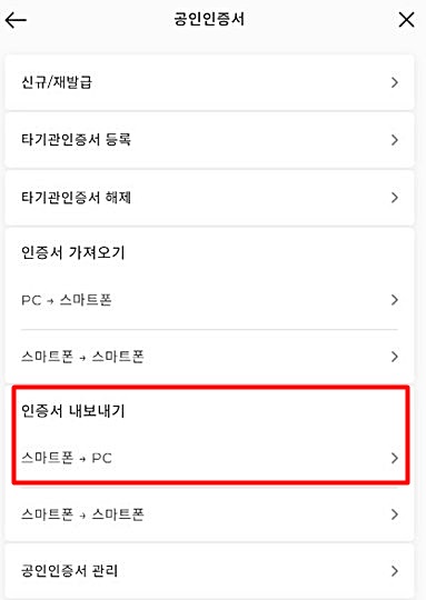 기본 설정은 PC → 스마트폰으로 되어있기 때문에 두 번째 칸에 표시되어있는  스마트폰 인증서 → PC로 내보내기를 선택하면 된다.