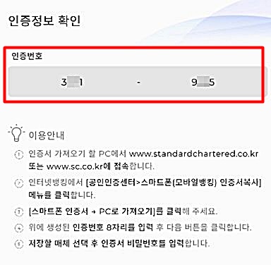 현대 전화에 저장된 인증서를 선택하고 나면 위와 같이  총 8자리의 숫자가 나오는 것을 확인할 수 있다. 이 번호는 아주 중요한 번호인만큼 휴대폰을 잠시 내려두고 pc로 sc은행 홈페이지로 접속하면 된다.