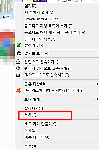 자신의 컴퓨터에 저장된 공인인증서를 USB로 옮기는 벙법은 정말 간단하다. 그냥 복사만 해서 갖다 붙이면 되기 때문이다. 공인인증서 폴더를 마우스 우클릭한 후 복사 버튼을 누른다.