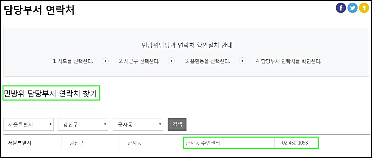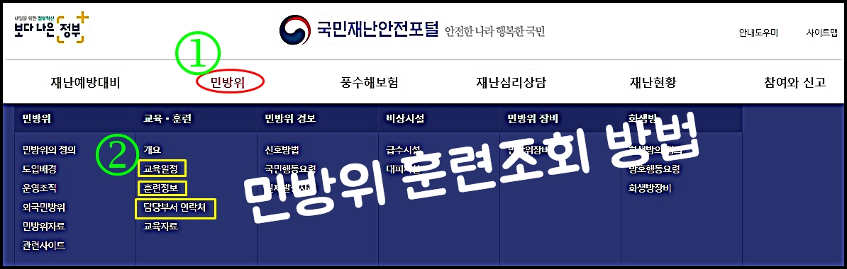 위 사진에서 보았던 것처럼 민방위 카테고리의 교육일정, 훈련정보, 담당부서 연락처를 참고하면 알 수가 있다.