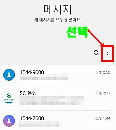 스팸 문자를 해제하기 위해서는 우선 자신의 메시지 보관함으로 접속을 한다. 메세지 목록을 보면 우측 상단에 점세개가 나란히 있는 더보기 표시가 있다.