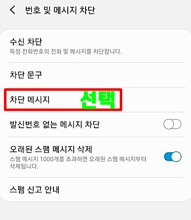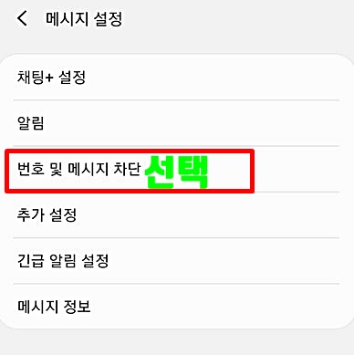 해당 버튼을 누르면 설정에 대한 부분이 나오는 것을 확인할 수 있다. 설정으로 진입을 해서 번호 및 메시지 차단이라고 안내가 되는 항목을 선택하자.