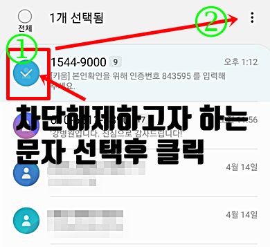 편집 버튼을 누르고 난 후 차단을 해제하고자 하는 문자를 선택하면 우측 사진과 같이 체크표시가 되는 것을 확인할 수 있다. 이렇게 체크 표시가 된 후에는 다시 더보기 버튼인 점 세 개 버튼을 눌러보자.