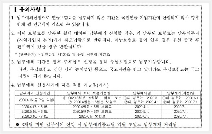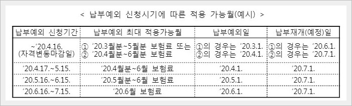 적용기간은 2020년 3월분~6월분의 보험료중 최대 3개월까지 납부예외가 가능합니다. 신청방법은 상당히 간단하게 되어있어 신속하게 접수할 수 있는 점이 특징입니다.