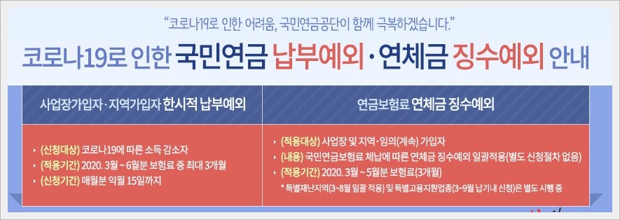 착한 임대인들이 늘어나면서 세입자들의 부담을 덜어주는가 하면 정부 및 지자체에서도 다양한 지원을 통해서 힘들어하는 주민들에게 많은 도움을 주기 때문입니다. 얼마 전 국민연금 관리공단에서는 코로나 사태로 인하여 소득이 줄어든 사람들을 대상으로 국민연금 납부유예 발표를 하기도 했습니다.