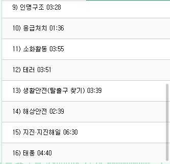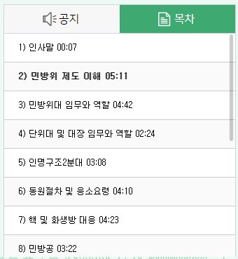 동영상 시청시 주의할 점은 16강의 동영상이 끝나고 나면 출제되는 스마트 민방위 교육 문제가 나오기 때문에 집중해서 듣는것이 중요하다.