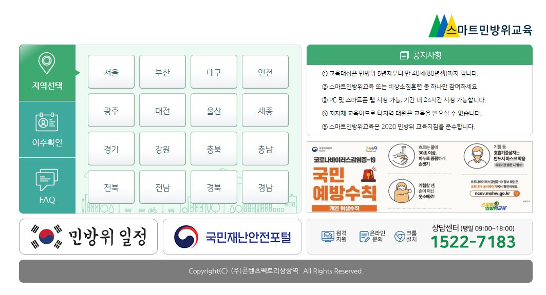 포털사이트를 통해서 스마트 민방위 교육을 검색하면 위와 같은 홈페이지에 접속이 가능하다. 자신이 현재 거주하고 있는 해당 지역을 선택해서 입장하면 된다.