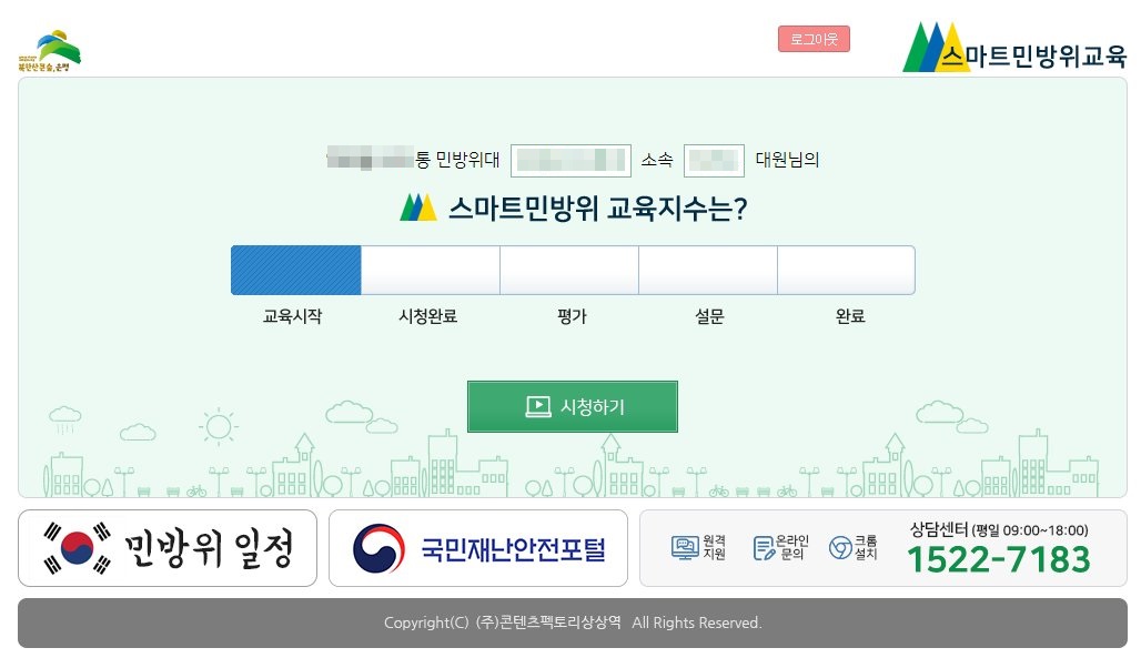 자신의 성함 주민번호, 핸드폰 뒷자리 4자리를 통해서 본인 확인 절차가 되어야만 비로소 사이버 교육을 시청할 수가 있다. 민방위 사이버교육 시간은 대략 50분 정도가 소요된다.
