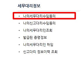 홈택스에 들어가서 조회/발급 버튼을 누르면 세무대리정보 카테고리가 있다. 해당 카테고리로 진입하면 나의 세무대리 수임 동의를 확인할 수 있다.