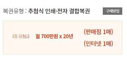 이럴 경우 당첨금을 살펴보면 1등 당첨금 월 700만 원과 2등 당첨금 월 100만 원씩 x 4장이 당첨되면서 월 1,100 만원이라는 금액을 받을수가 있습니다.