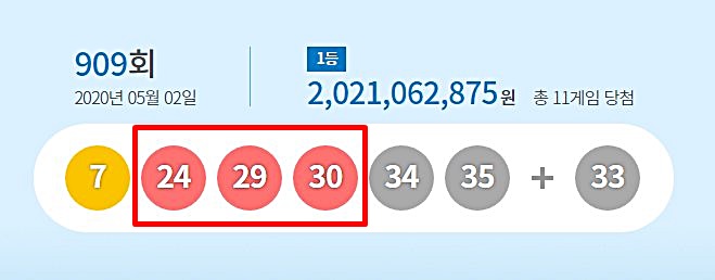 이번 주 로또 당첨번호는 7, 24, 29, 30, 34, 35 보너스 번호 33번으로 발표가 되었습니다. 지난주에 이어 이번 주에도 20번대 구간에서 3자리의 번호가 출현을 했습니다. 한 구간에서 이렇게 번호가 몰리게 되면서 결국 10번대, 40번대 구간의 경우 한자리의 수도 나오지 않게 되었습니다.