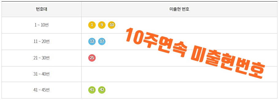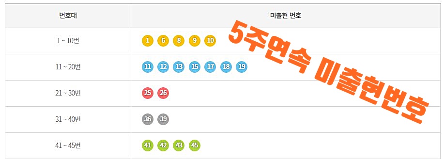 특히 최근 5주간 10번대 구간의 번호는 1등 번호로 출현을 하지 않은 번호가 무려 7개나 되는것을 알 수 있습니다.