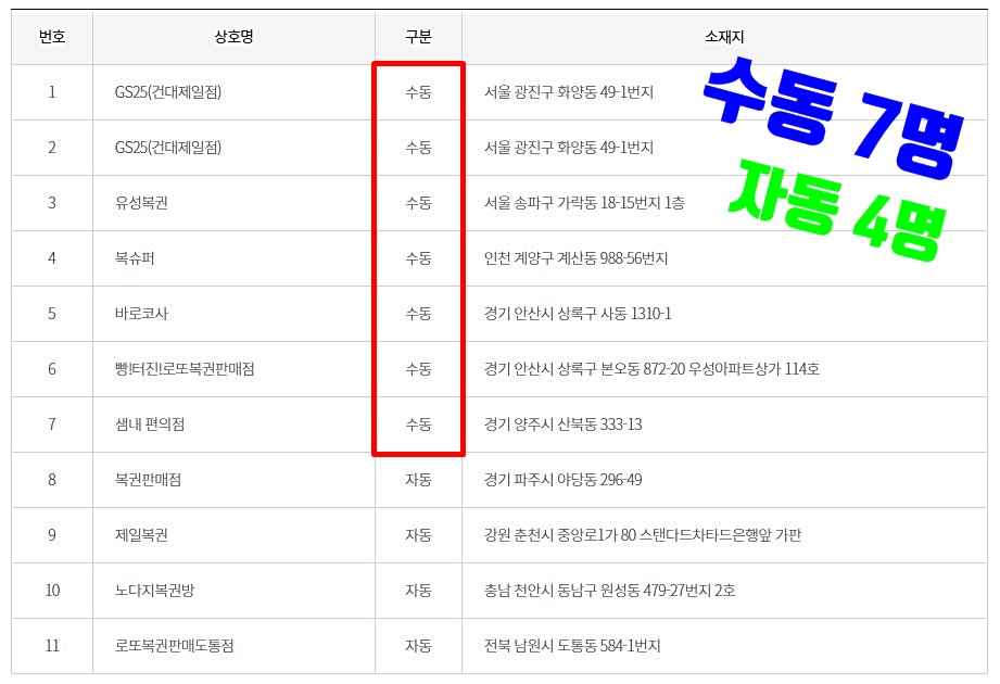 두장 모두 수동당첨자 인 점으로 미루어 봤을 때 아마도 동일 인물이 수동으로 같은 번호를 적은 것이 아닐까 예상을 하게 되는 것 같습니다. 지금까지의 사례로만 살펴봐도 한 곳에서 자동이 아닌 수동으로 복수의 당첨자가 나온 경우 대부분 동일인물이었기 때문입니다.