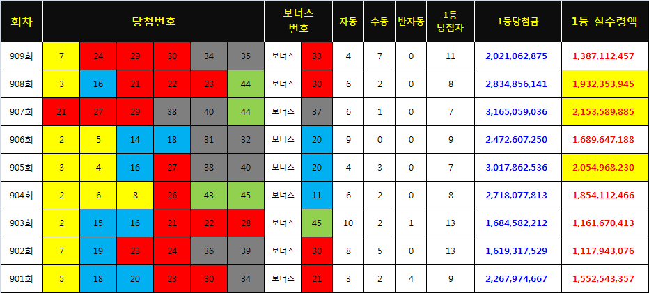 매주 당첨자들의 통계를 살펴보면 수동 구매보다는 자동 구매자들의 당첨 확률이 높은 편입니다. 그 이유 중 하나가 사람이 생각하는 한계를 넘어 기계적인 조합으로 번호를 구성하기 때문이 아닐까 생각합니다. 일반적인 사람들의 경우 각 구간별로 골고루 구매하는 습성이 있기 때문에 909회 당첨번호와 같이 한 구간에 3자리의 번호가 나온 회차의 경우 당첨자도 적으며 당첨금액도 높은 것이 특징이라 할 수 있습니다.