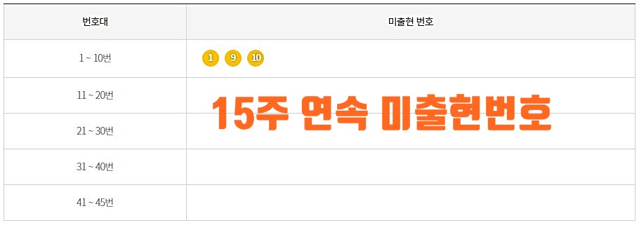 범위를 넓혀서 10주간 미출현 번호를 살펴보면 1번대 구간에서 세 자리의 번호가 10주 동안 나오지 않고 있습니다. 기간을 더 늘려서 15주로 조회를 해봐도 역시 동일하게 1번대 구간의 번호들이 출현율이 낮음을 알 수 있습니다.