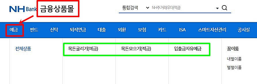 농협은행 정기예금 및 적금 상품을 살펴보면 목돈굴리기 예금, 목돈 모으기 적금, 입출금 자유예금으로 나뉘어 있습니다.