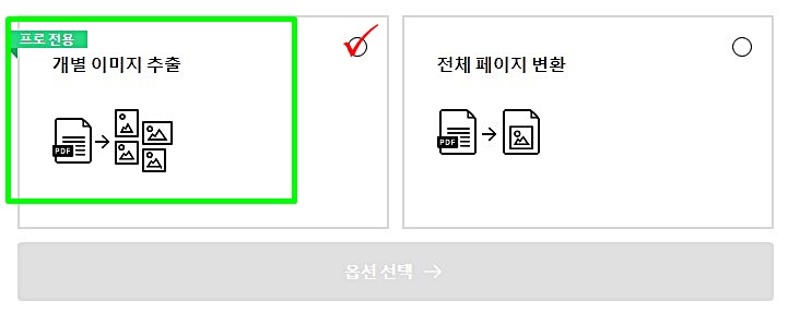 다만 조금 다른점이 있다면 여러 개의 페이지로 된 pdf 파일의 경우 개별 이미지를 추출할 것인지 전체 페이지로 변환할 것인지를 선택해 줘야 한다는 점입니다.
