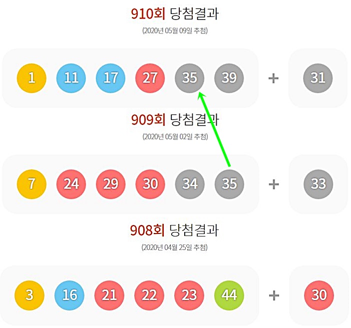 910회 로또 당첨번호는 1, 11, 17, 27, 35, 39 보너스 번호 31번으로 발표가 되었습니다. 최근 3주간 로또 당첨번호 패턴을 살펴보면 20번대 구간의 번호가 다소 주춤하는 것 같으면서 10번대와 30번대 구간에서 번호들이 출현한 점이 특징인 것 같습니다.