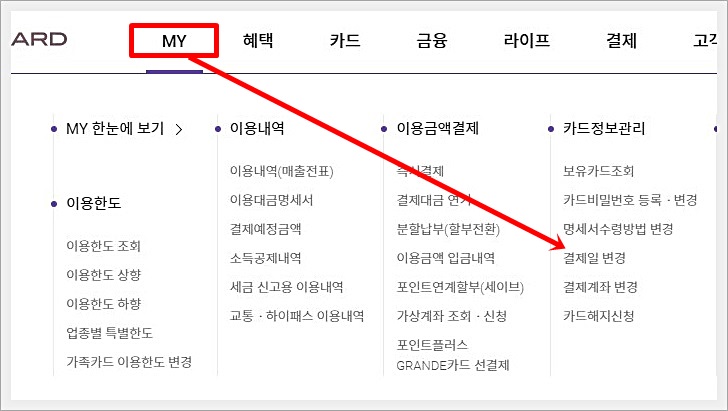 대부분의 카드사가 동일하게 이러한 마이페이지에서 결제일 변경 및 이용기간을 확인할수가 있습니다. 롯데카드 결제일별 이용기간을 살펴보기 위해서는 결제일 변경 페이지로 접속해야 확인할 수 있습니다. 결제일 변경은 상단 카테고리 중 MY → 결제일 변경으로 접속하면 됩니다.