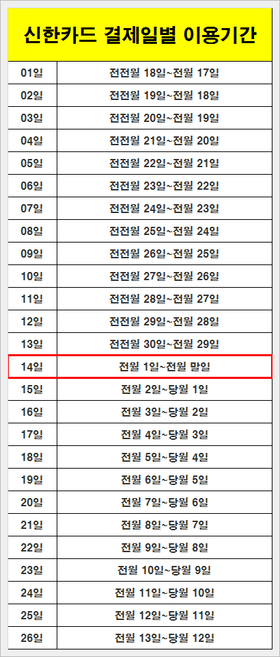 결제일별 이용기간을 그렇게 확인하고 나서야 급여일에 맞춰서 결제일을 변경하고자 했습니다. 아래 표는 신한카드 결제일별 사용기간이니 참고하시기 바랍니다.