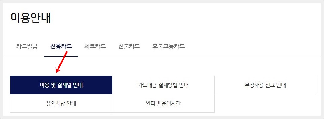 답답하긴 했지만 내일이 급하기 때문에 해당 이용안내 페이지로 들어갔습니다. 해당페이지에 접속하면 여러 가지 파트로 또다시 나누어지는데 여기서 신용카드 업무를 선택해야만 신한카드 결제일별 이용기간을 확인할 수 있었습니다. 아시다시피 결제 날짜에 따라서 사용기간이 달라지기 때문에 결제일 변경을 하기전에는 이용기간을 꼭 확인해 봐야 할 테니까요.