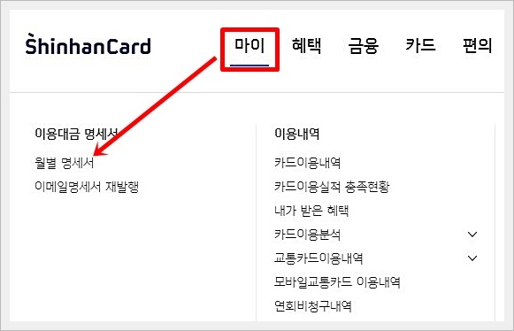 힘들게 검색을 통해 찾아보니 신한카드 결제일 변경은 상단 카테고리 마이페이지 접속 후 월별 명세서를 통해서 할 수가 있었습니다.