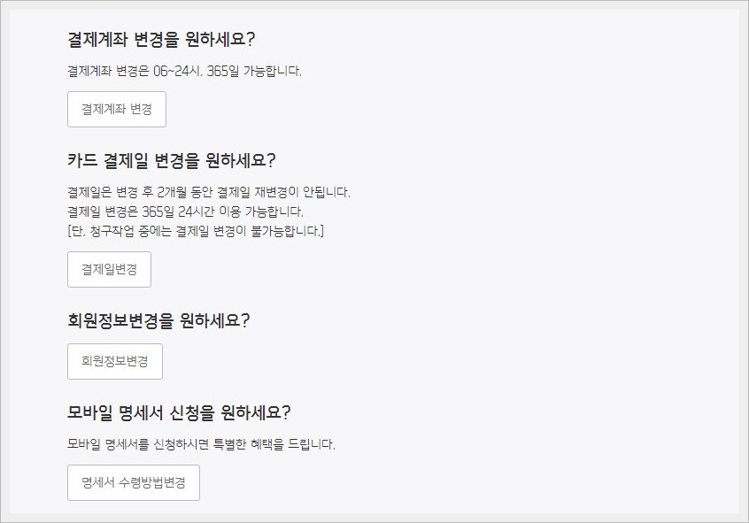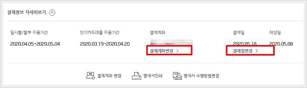 월별 명세서를 클릭하고 들어가니 이제야 제가 궁금했던 결제계좌변경, 결제일 변경 등의 항목이 있더라고요. 그래도 결제일 변경을 찾아서 안도의 한숨을 쉬면서 해당 페이지로 넘어갔습니다.