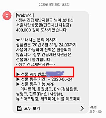 전 국민 재난지원금 지급이 결정되고 난 후 많은 사람들이 지원금을 수령했다고 합니다. 마스크 5부제와 마찬가지로 출생 연도에 따라서 신청하다 보니 늦게 신청한 분들도 계실 텐데요. 저 역시 오늘에서야 지급을 받게 되었습니다. 서울사랑 상품권으로 신청을 했는데 지난주 금요일에 신청한 지 3일 만에 문자메시지로 핀번호를 받을 수 있었습니다.