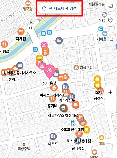 제로페이 사용법을 살펴보면 앱 하단에 있는 가맹점 찾기 버튼을 통해서 자신이 가고자 하는 음식점 또는 사업장을 검색할 수 있습니다. 지도로 검색하게 될 경우 제로페이 가맹점들이 표시되어 안내가 되기 때문에 쉽게 찾을 수가 있습니다.