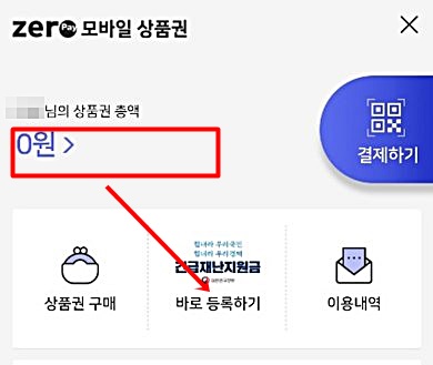 이미지를 클릭하면 비로소 문자메세지로 받은 제로페이 핀번호를 등록할 수 있는 페이지가 나오게 됩니다. 현재는 잔액이 0원으로 나와있는 것을 확인할 수 있습니다. 핀번호 등록은 아래 나와있는 긴급재난 지원금 바로 등록하기 버튼을 누르면 가능합니다.
