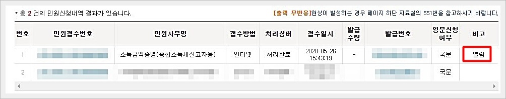 이렇게 절차를 다 마무리했다면 신청하기 버튼을 누르면 5초도 안돼서 신청 완료 안내가 나오는 것을 확인할 수 있습니다.  인터넷 홈텍스를 이용한 소득금액 증명원 발급비용은 무료이며 열람 또한 무료로 제공됩니다.
