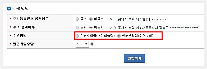 세 번째로 주민등록번호 공개 여부 체크 및 인터넷 발급 여부에 대해서 선택하면 됩니다. 금융기관의 경우 사용처에 따라서 주민번호가 모두 필요할 수 있기 때문에 꼭 사용처에서 원하는 서류 양식으로 발급받는 것이 중요합니다.