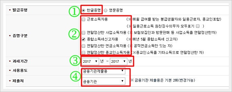 일반적으로 소득금액 증명원을 발급하는 대부분의 경우가 소득신고 및 금융기관 제출을 위한 경우가 많습니다. 각자 자신의 용도에 맞도록 선택을 합니다. 그 후 과세기간을 선택한 후 사용용도까지 선택하면 됩니다.