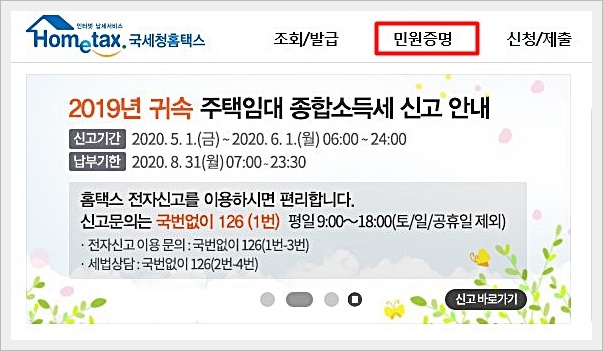 홈텍스에 접속한 후 상단에 안내되어 있는 민원증명 카테고리를 선택하면 됩니다. 우리가 발급 받고자 하는 서류의 이름이 소득금액 증명원인 만큼 민원증명 카테고리에서 해결을 할 수 있는 것입니다.