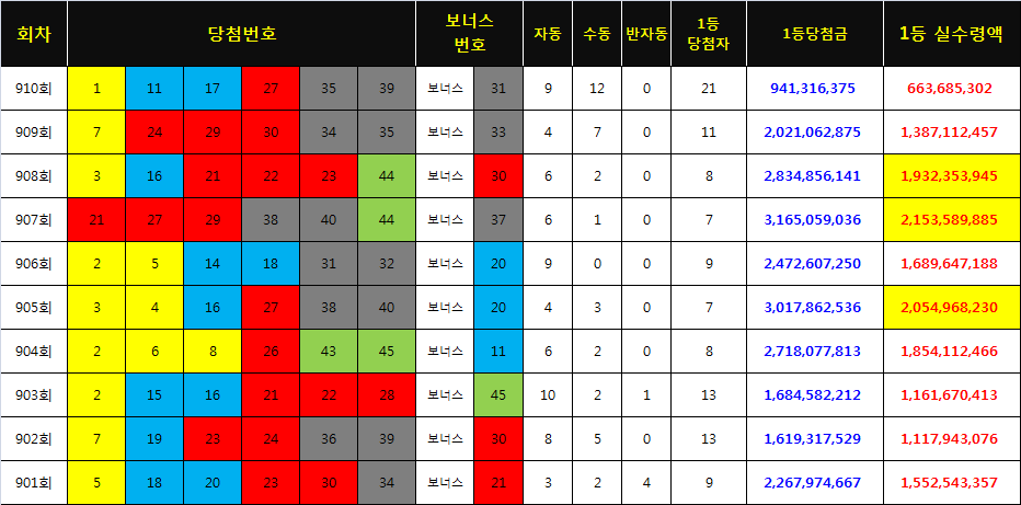 1등 당첨자는 총 11명으로 발표가 되었습니다. 그중 자동구매 7명 수동 구매가 4명으로 조사되었습니다. 매주 당첨자 추첨 때마다 느끼지만 자동 구매자가 많아서 인지 자동 당첨 확률이 높은 것 같은 생각이 드는군요.