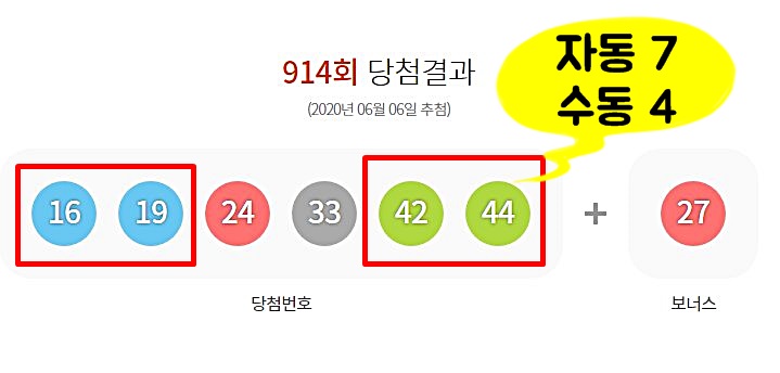 지난주 발표된 로또914회 당첨번호는 16, 19, 24, 33, 42, 44 보너스 번호 27번으로 확인되었습니다. 모처럼 40번대 구간에서 두 개의 번호가 출현한 것이 특징인 것 같습니다. 그동안 꾸준히 출현하단 1번~10번대 구간에서 한자리의 번호도 나오지 않은 것 또한 이변 아닌 이변인 것 같습니다.