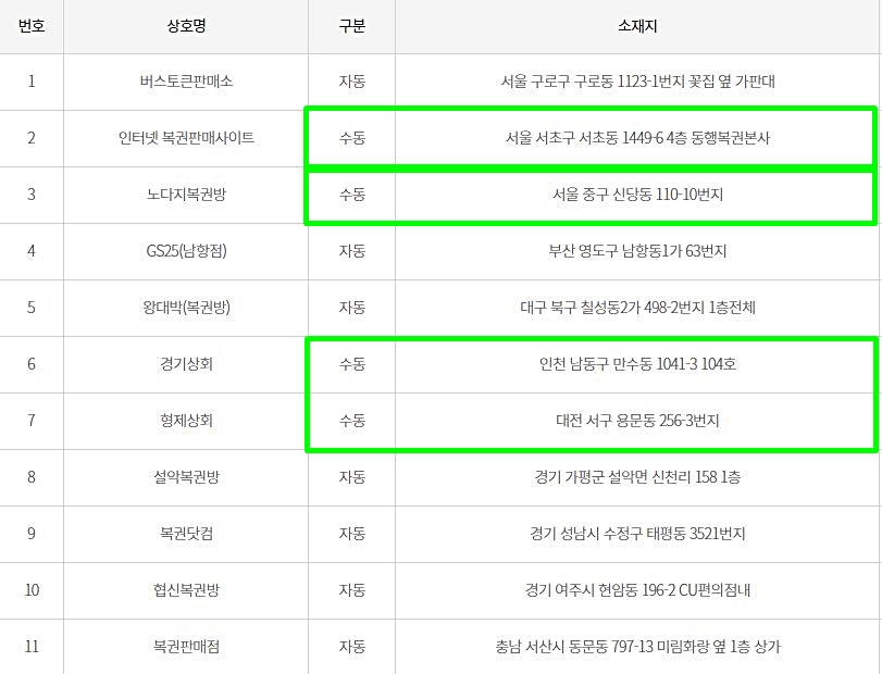 914회 로또 당첨지역을 살펴보면 수도권에서 많이 나왔습니다. 서울 3곳, 부산 1곳, 대구 1곳, 인천 1곳, 대전 1곳, 경기 3곳, 충남 1곳으로 서울, 경기, 인천에서만 총 7명입니다. 온라인 복권 판매 사이트에서도 1등 당첨자가 나왔는데 수동으로 구매한 분이라고 합니다.
