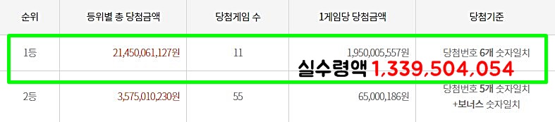 1등 당첨금은 로또 세금인 33%를 제하면 1인당 실수령액이 13억 3950만 원 정도가 돌아갑니다. 2등의 경우 전국적으로 55명이 당첨되었는데 1인당 6,500만 원(세전)씩이라고 합니다.